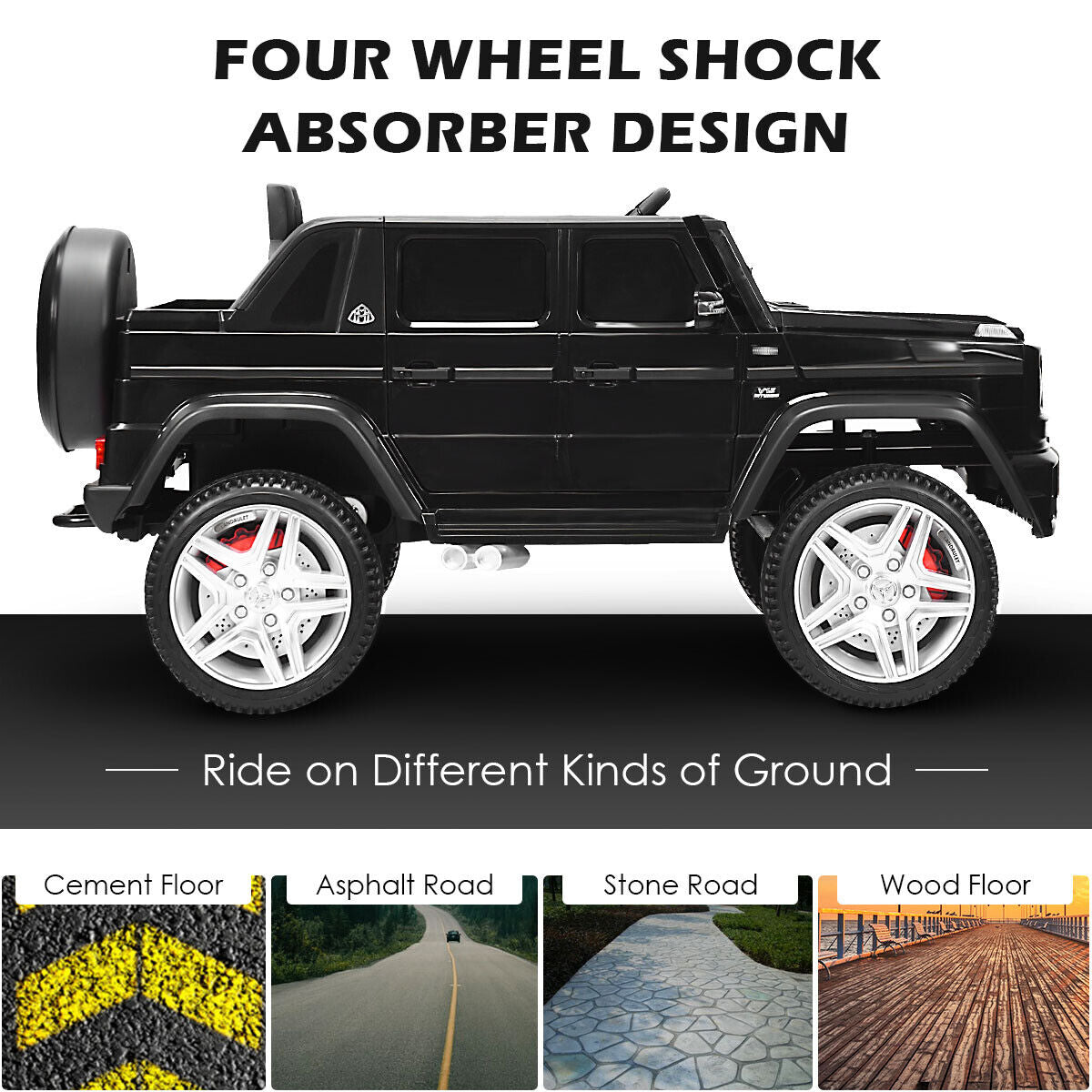 ● 2 Optional modes parental remote control mode and battery-operated mode● High/low speeds in B/O mode 3 variable speeds in R/C● Feel free to move forward or backward● Built-in music and story for the happy driving experience USB TF interface for more choices● Bright LED lights light up the dark surroundings and add more driving fun● Spring suspension equipped on each wheel enables a smooth drive● Soft start and stop free your kids from potential danger caused by rapid speed● Wide seat with safety belt combines higher comfortableness and safety● Can open and lock 2 doors with the safety lock● Equipped with a humanized handle to help you pull the car with ease● Store kids' favorite toys in the back storage box when driving outside● Suitable for different kinds of ground such as the wood floor asphalt road brick road etc● Licensed Mercedes-Benz Maybach kids car cool design to cheer up kids Installation guide