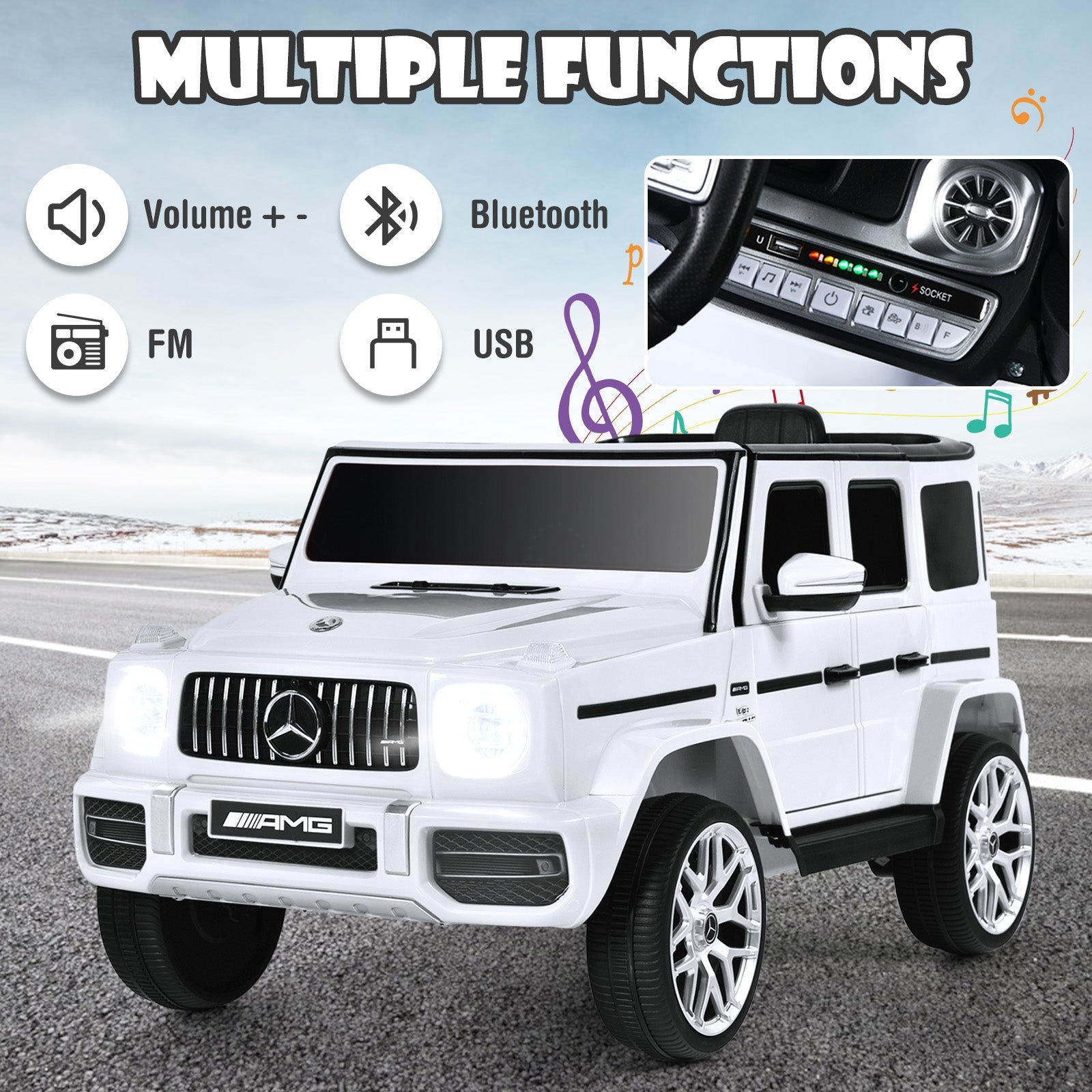 Get ready for a fun safe ride inside the perfect Mercedes ride on a car for kids ages 3+. Kids can not only enjoy the fun of driving through the steering wheel and acceleration pedal but also have a great time with the multiple media functions (FM/Music). The realistic appearance of models from the real Mercedes-Benz G63 gives the kids a real-life feel with a 2-mode light system to intensify the thrill. A 2.4G remote is ready for parents to choose the direction and the speed. And with four-wheel spring suspension system and a slow start system this car runs smoothly and safely on most of the ground. It is designed for 1 rider under 66 lbs of limitation. And the 12V 4.5A rechargeable battery can last for 50mins. If you are looking for a kids ride on a car like this do not hesitate to place an order! Change the window settings of the doors at will Opening doors and locks one belt for each seat for safety consideration Mini Mercedes-Benz licensed G63 ride on car for kids of 3+ Ride with parental control with 2.4G remote and manual mode Lights can stay on flash and turn off for the atmosphere Spring suspension and slow start systems to make sure a smooth and safe ride Equipped with music radio USB socket volume switch/previous & next button An ideal gift to entertain both adults and children Weight limitation of 66 lbs for 1 rider speed of 2-3 mph 50 mins of playtime at each charge