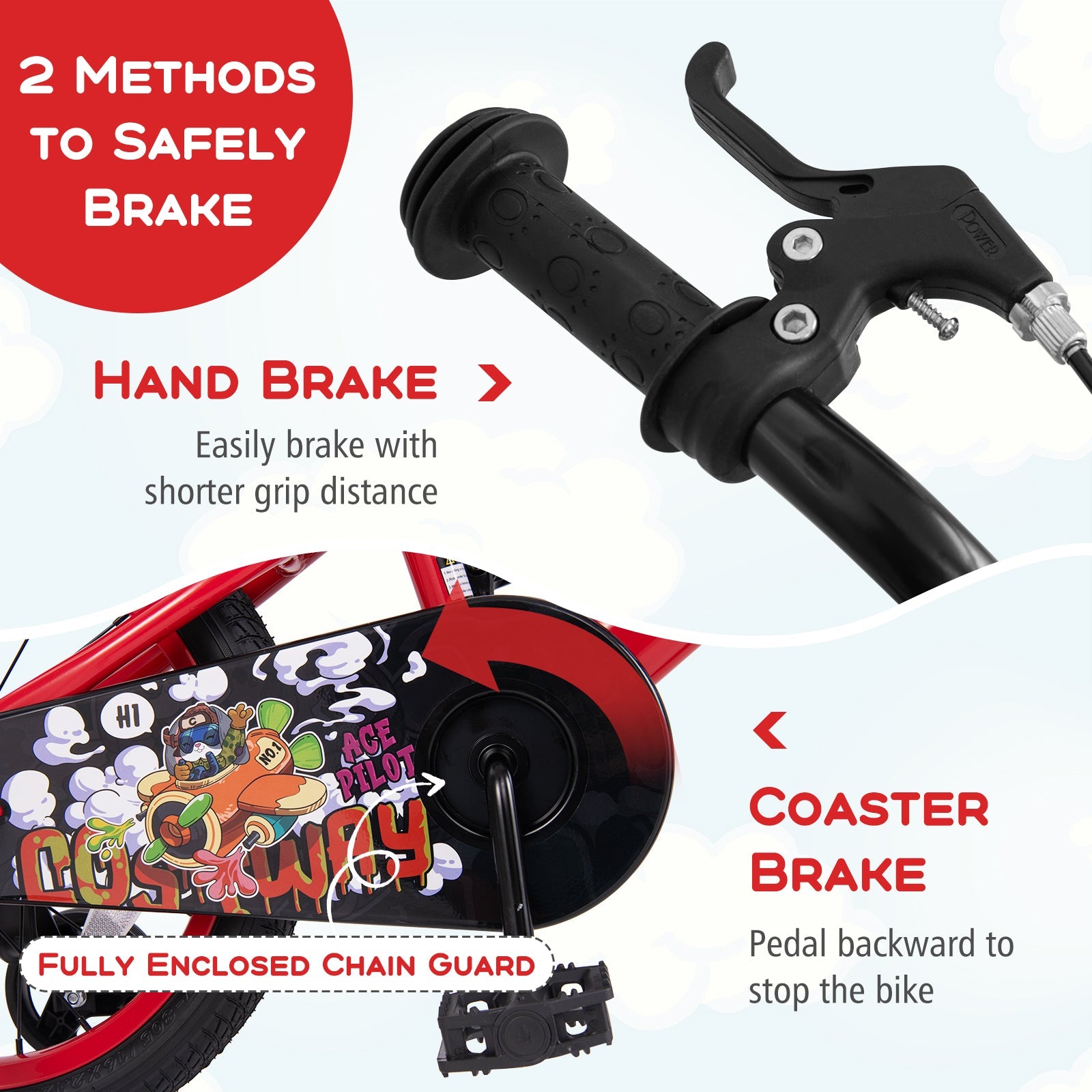 ● Our bike: 95% pre-assembled design better than other bikes: 85% pre-assembled ● Equipped with a hand brake and rear coaster brake to easily stop the bike● 2 removable training wheels turn the bike into a triangular structure for high stability● 26.5"-28"/30"-31.5"/31"-32.5"/33"-34.5"adjustable handlebar and 17.5"-19.5"/19.5"-22"/23"-25.5"/25"-27.5" adjustable seat● Locking devices to fix the seat height● Front basket to store kid's belongings ● The solid carbon steel frame for long-term use● Anti-puncture and shock-absorbing rubber wheels for steady riding● The tires feature 3 layers: rubber outer inner tube and rim rape ● Front and rear reflectors for enhanced security● Fenders prevent mud splashing● Non-slip pedals and ergonomic seat make it safe and comfortable to ride● Considerate kickstand for convenient stop(18-inch bike only)● Top bell for added fun Installation guide