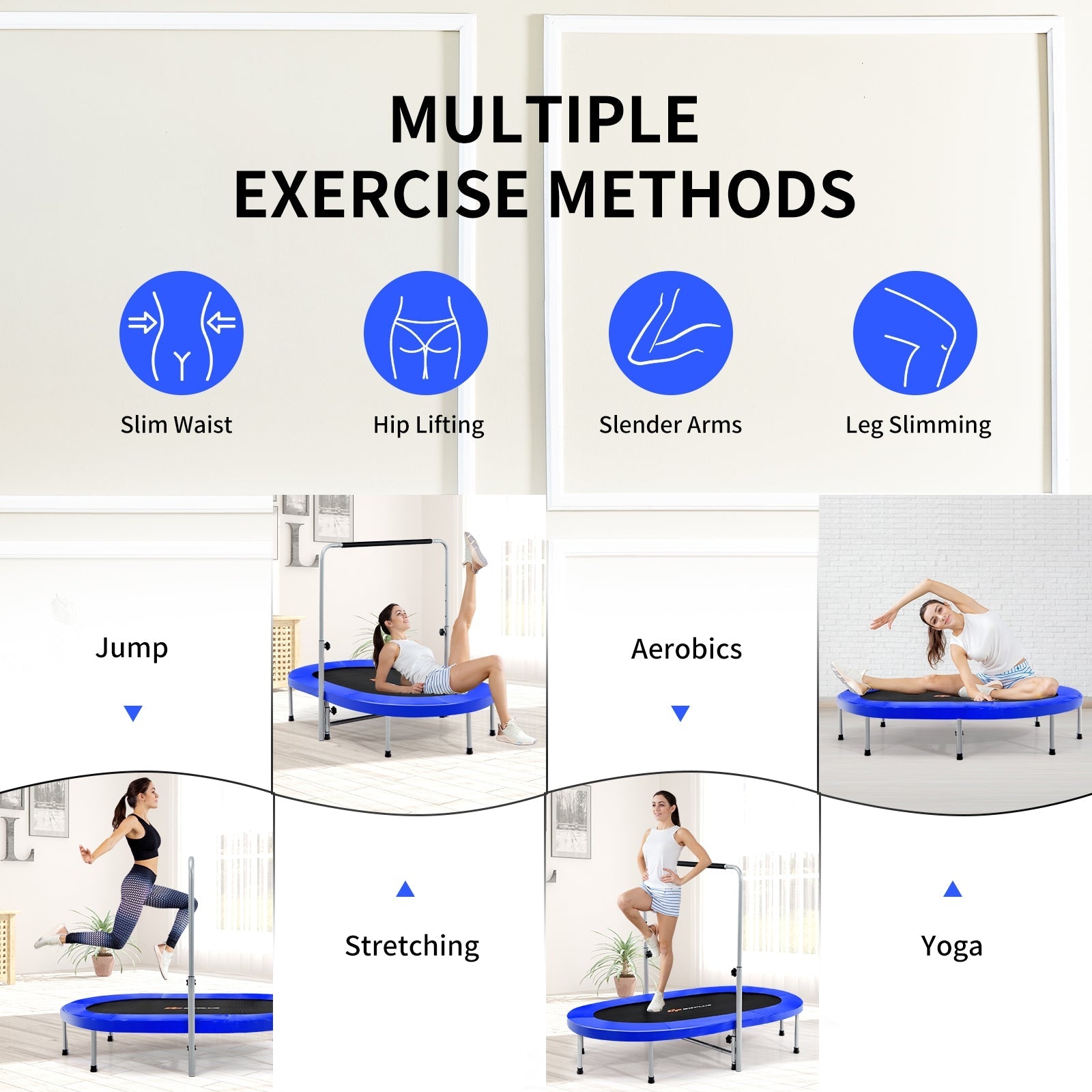 ● Height adjustable in 5 levels from 36"-52" fitting people of different heights● Constructed in a strong steel pipe frame with a weight capacity of up to 330lbs● 40 sturdy springs helping balance the pressure evenly for a long time of use● 6 steel legs with non-slip pads ensuring overall stability and protecting the floor● Wide jumping area suitable for 2 people to bounce together at the same time● Tear-resistant PP jumping mat with great durability featuring high elasticity● Foam-padded handle designed for a comfortable grip during jumping● Foldable design for easy storage and transportation when not in use● Easy to assemble with the help of the detailed instructions● Package includes: 1 x Double trampoline 1 x User's manual