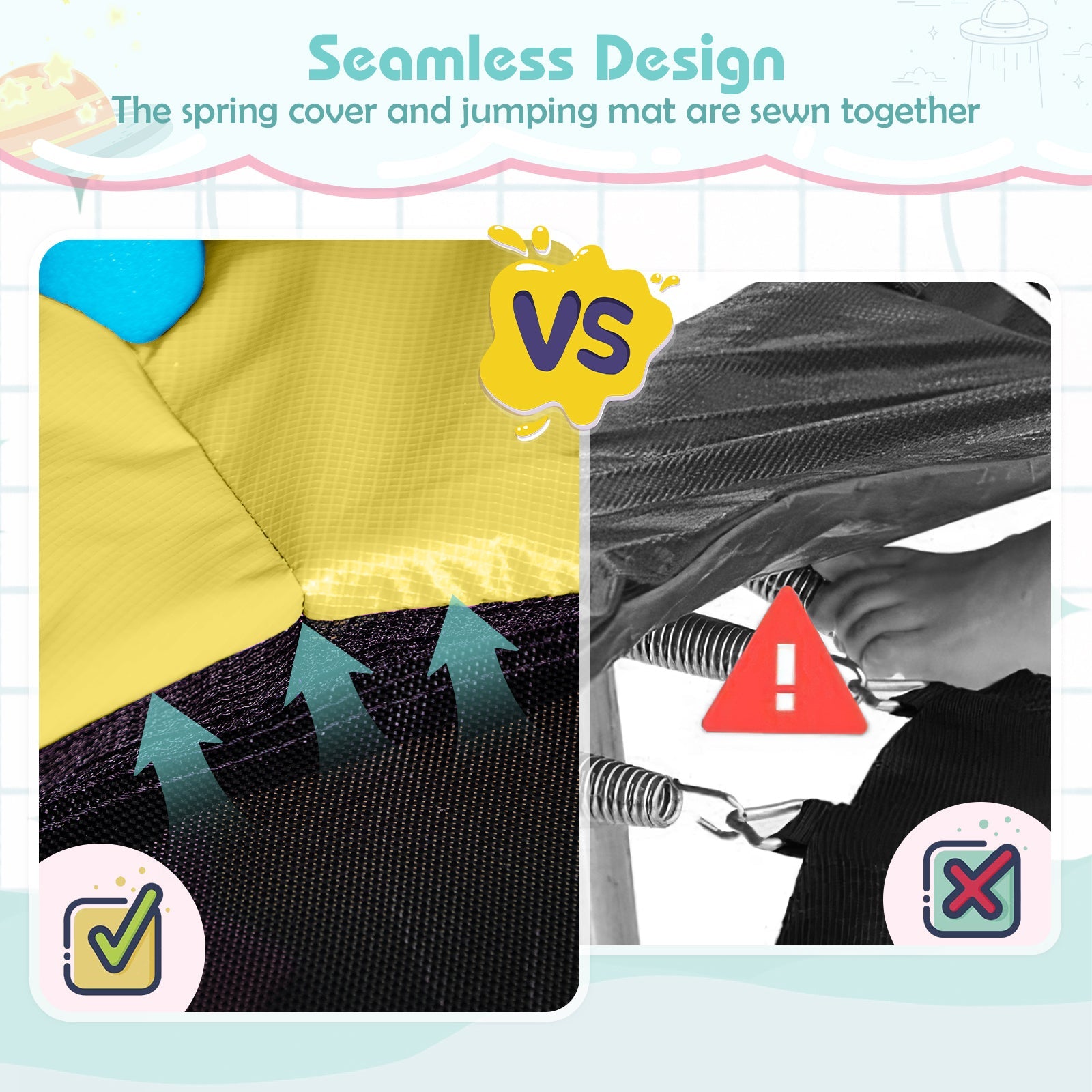 ● Detachable canopy with durable fixing straps for firm connection● Rain-proof and sun-proof canopy for indoor and outdoor use● Heightened safety enclosure net for all-round protection● Foam wrapped handrail for a safe and comfortable grip● 6 curved metal legs with anti-slip foot pads for stable construction● 36 galvanized springs with sturdy hooks for strong connection● Extra-large zipper door for easy in and out of the child● Spring pad with 15 mm EPE foam and no gap design for protection● Elastic and breathable PP jumping mat with tests for happy bouncing● Perfect gift for kids to release their energy and promote motor skills● ASTM and CPSIA certifications for additional reliabilityInstallation guide