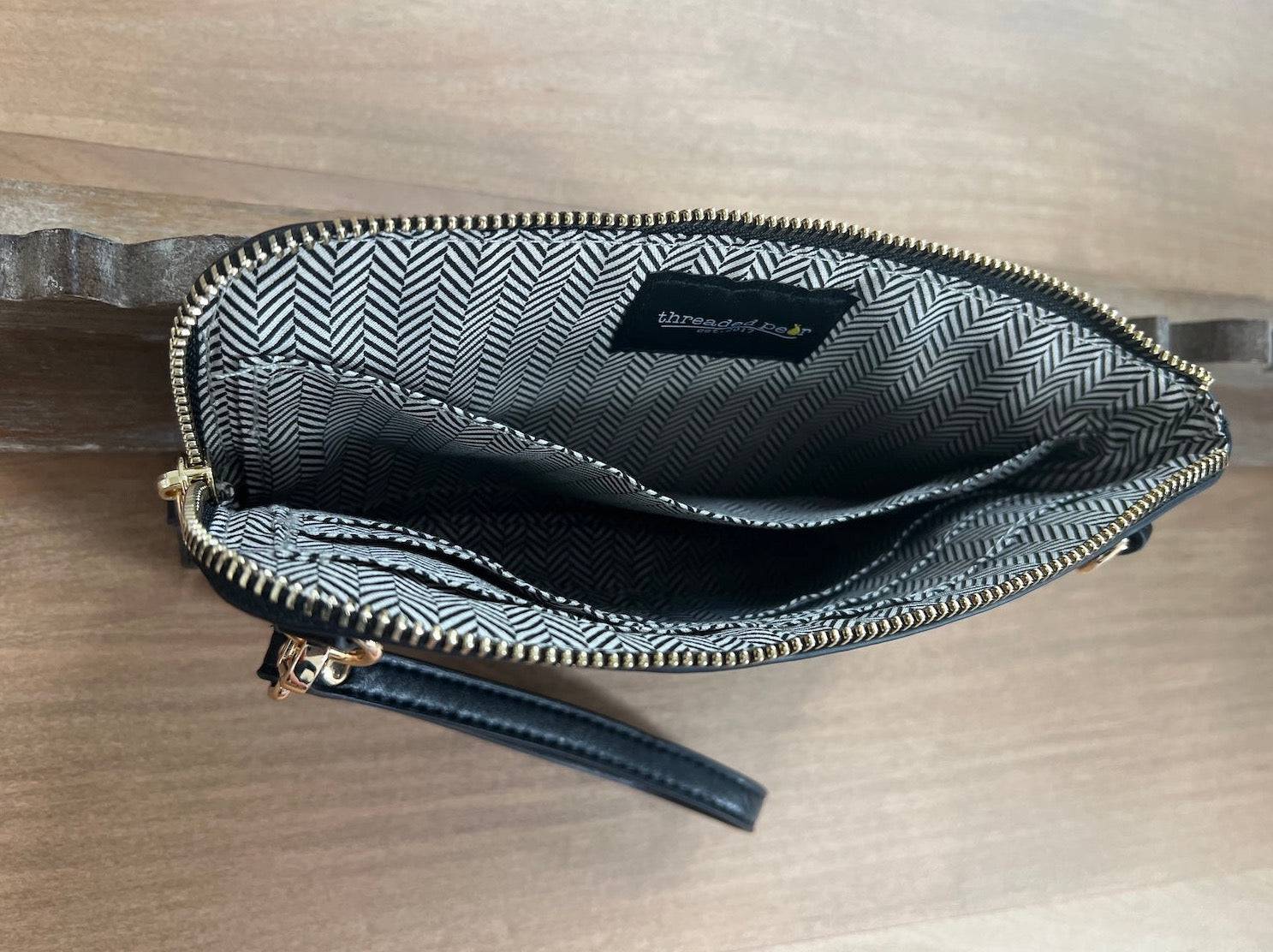 This adorable yet very functional vegan leather clutch is the perfect bag for your quick zips around town in style.This stunning bag features a space saving design perfect for your phone, wallet, keys, and other needed items without the bulk. Two strap options allow for versatility while the top zipper closure and lock keeps everything safe inside.