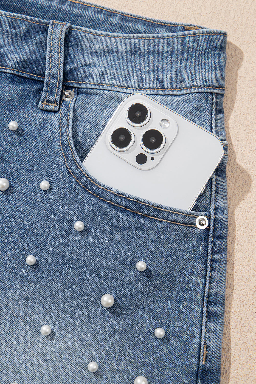 Pearls, raw hem, and a medium wash - these denim shorts have it all! They're unique, classic, and oh-so-fashionable. Perfect with a tank top or tee for any stylish lady.