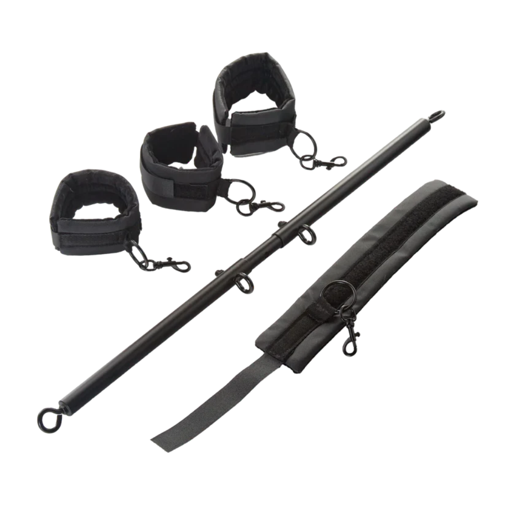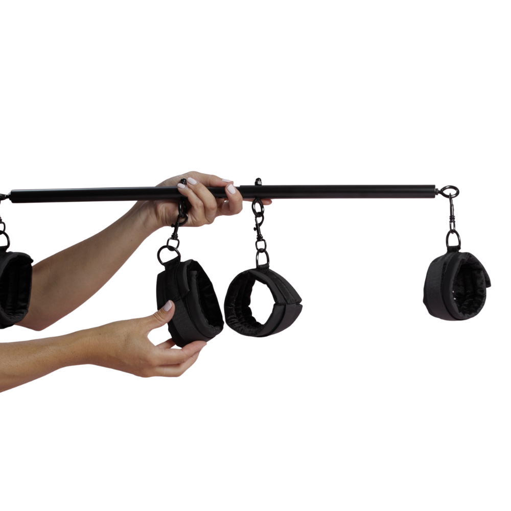Submit to lust and bare it all with this bar set. The four included cuffs and expandable bar allow for simple control or a variety of compromising positions. Feel the soft cuffs against your skin as your partner tightens them around your wrist, ankles, or both. Give in to their control as the bar extends, holding you in place. Passion, power, and pleasure collide in an unparalleled experience.