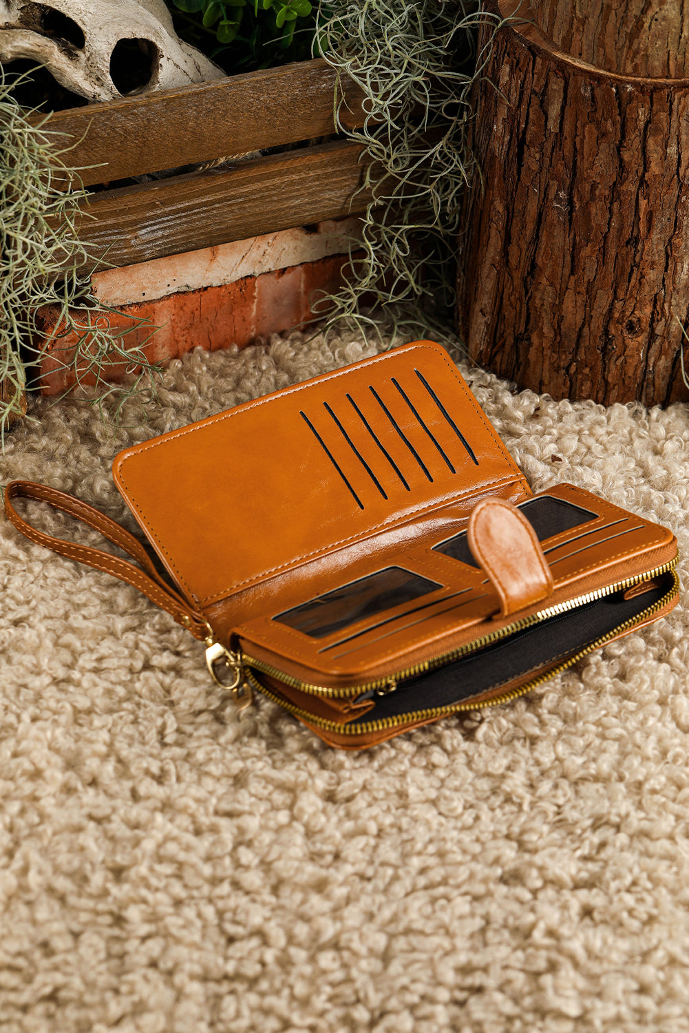 Get your hands on this chic wallet that combines both style and security with its zip-around design. The elongated shape offers plenty of room for your cards, cash, and other essentials. Plus, keep it close with the handy wrist strap. Crafted from premium faux leather, this wallet is sure to last you a long time.