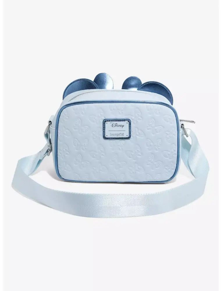 Loungefly Disney Minnie Mouse Blue Butterfly Crossbody Bag. Your style will be soaring with this crossbody! Fitted with metallic 3D ears, this Minnie Mouse-inspired bag features debossed butterflies and an adjustable shoulder strap.