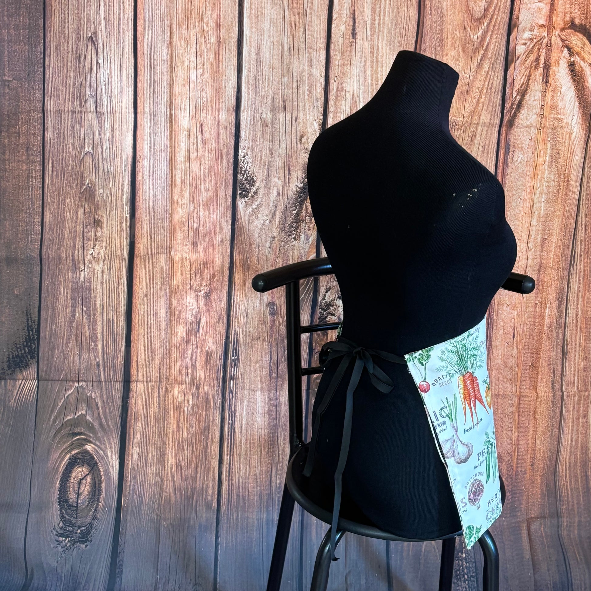 Our Imperfectly Perfect waisted Harvest Aprons have a simple drawstring design. Double lined for your choice of colors to add extra durability, for hauling that garden harvest. This apron is the Black and White/ Garden Veggie Print. Also comes with separate waisted,double lined, inserted pockets, apron in matching print.Â