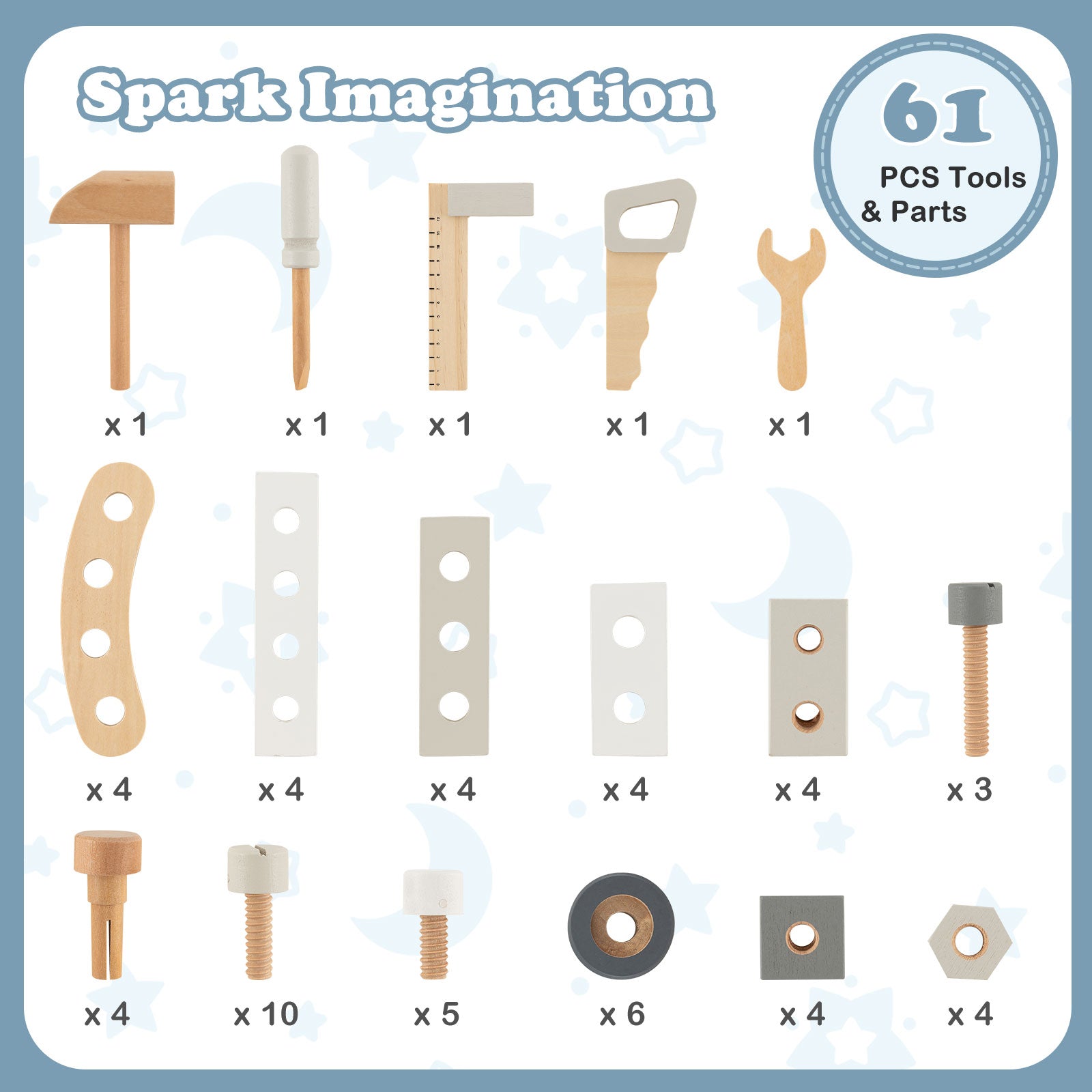 ● Realistic workbench set includes workbench chalkboard clock and more parts● 61pcs rich accessories with no burr for various combination methods● Kids can learn to use wrench saw wood measure size screw fixture etc● Spacious tabletop with slots and open shelf keep accessories organized● Selected wood materials for great strength and excellent durability● 18" countertop height for toddlers to get access to all accessories● Help kids develops motor skills inspire creativity and imagination● ASTM and CPSIA certification ensure superior safetyInstallation guide