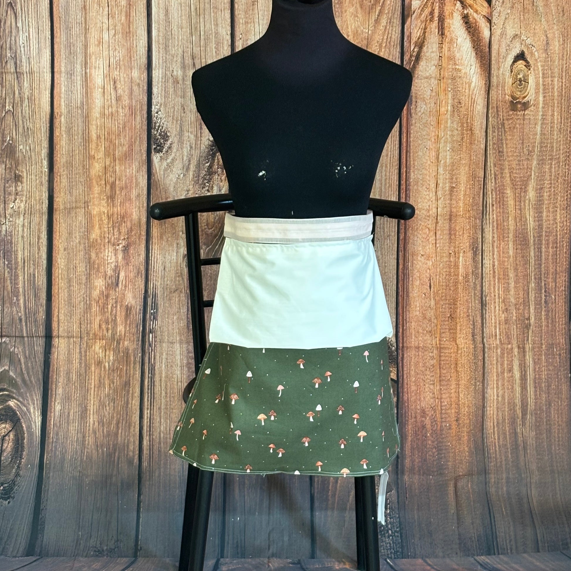 Our Imperfectly Perfect Handcrafted TShirt Apron in the “Mushroom Mountains” print. With matching waisted apron that has “kangaroo pouch” pocket, to keep all your necessities in! Both aprons double ones for extra durability.