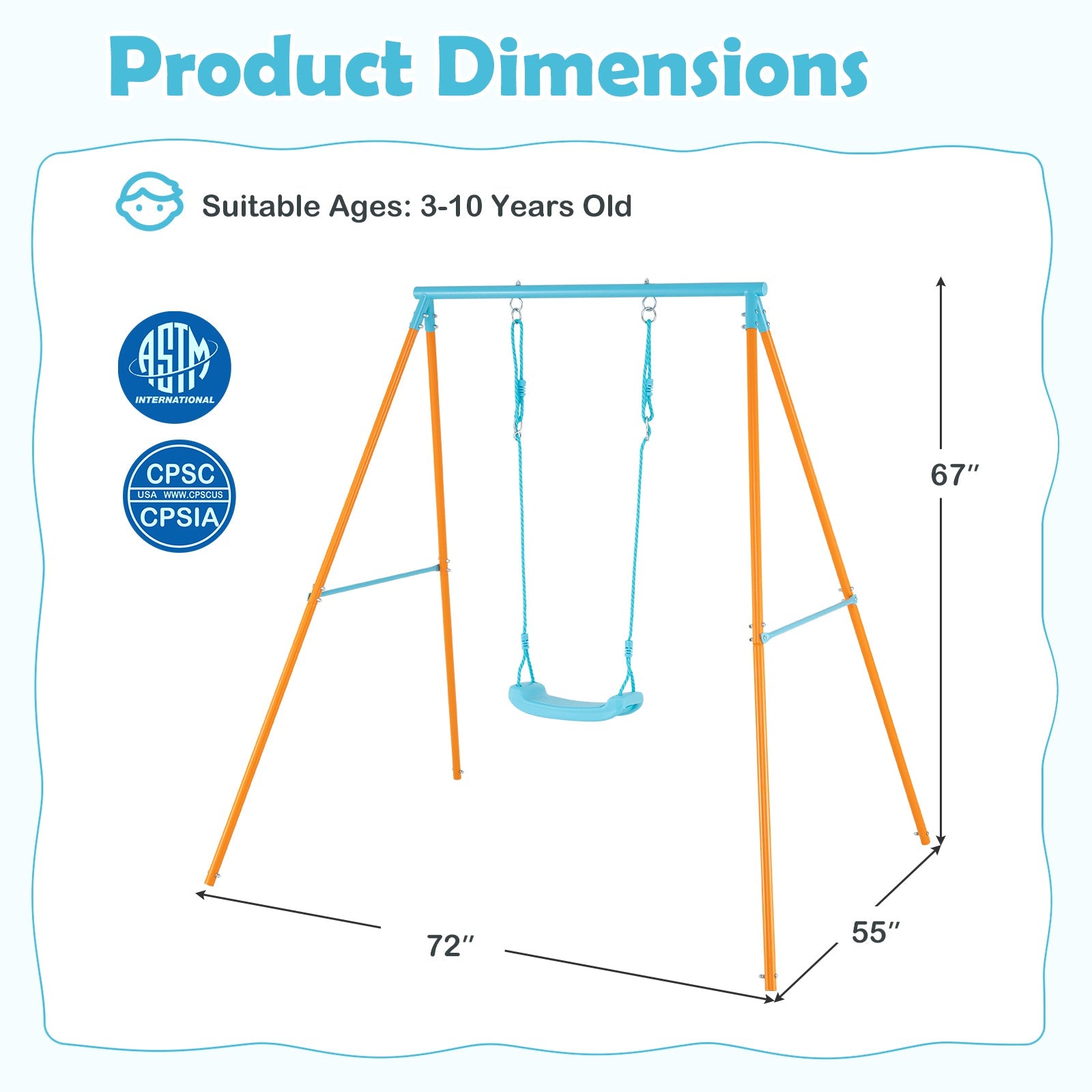 ● Curved seat ensures better contour to body curves for added comfort● Ideal for kids of different heights with adjustable seat height● Heavy-duty metal construction provides excellent sturdiness● Equipped with metal ground stakes for increased stability● Stable A-shaped frames with reinforced crossbars to add stability● Safe for children to swing with sturdy hooks and strong connections● Perfect gift for little ones to develop their essential skills● ASTM and CPSIA compliant for enhanced reliability● Easy to install to save you time and effort